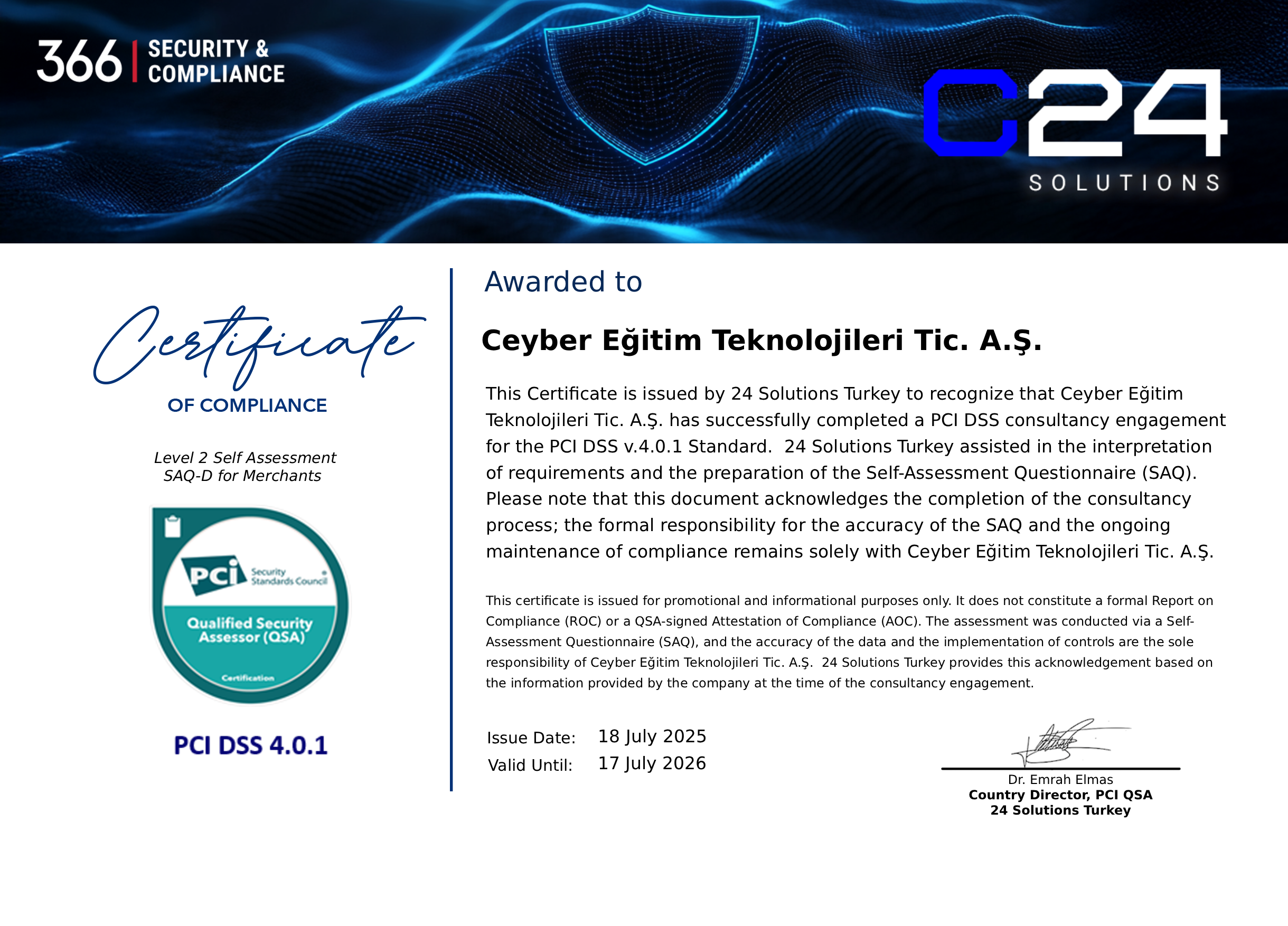CEYBER’de faaliyetlerimiz esnasında, bağlı olduğumuz ve hizmet verdiğimiz kuruluşların, çalışan ve tedarikçilerimizin güvenini temin etmek, verdiğimiz hizmetlerin etkin ve kesintisiz bir şekilde sürdürülmesini sağlamak öncelikli amacımızdır.